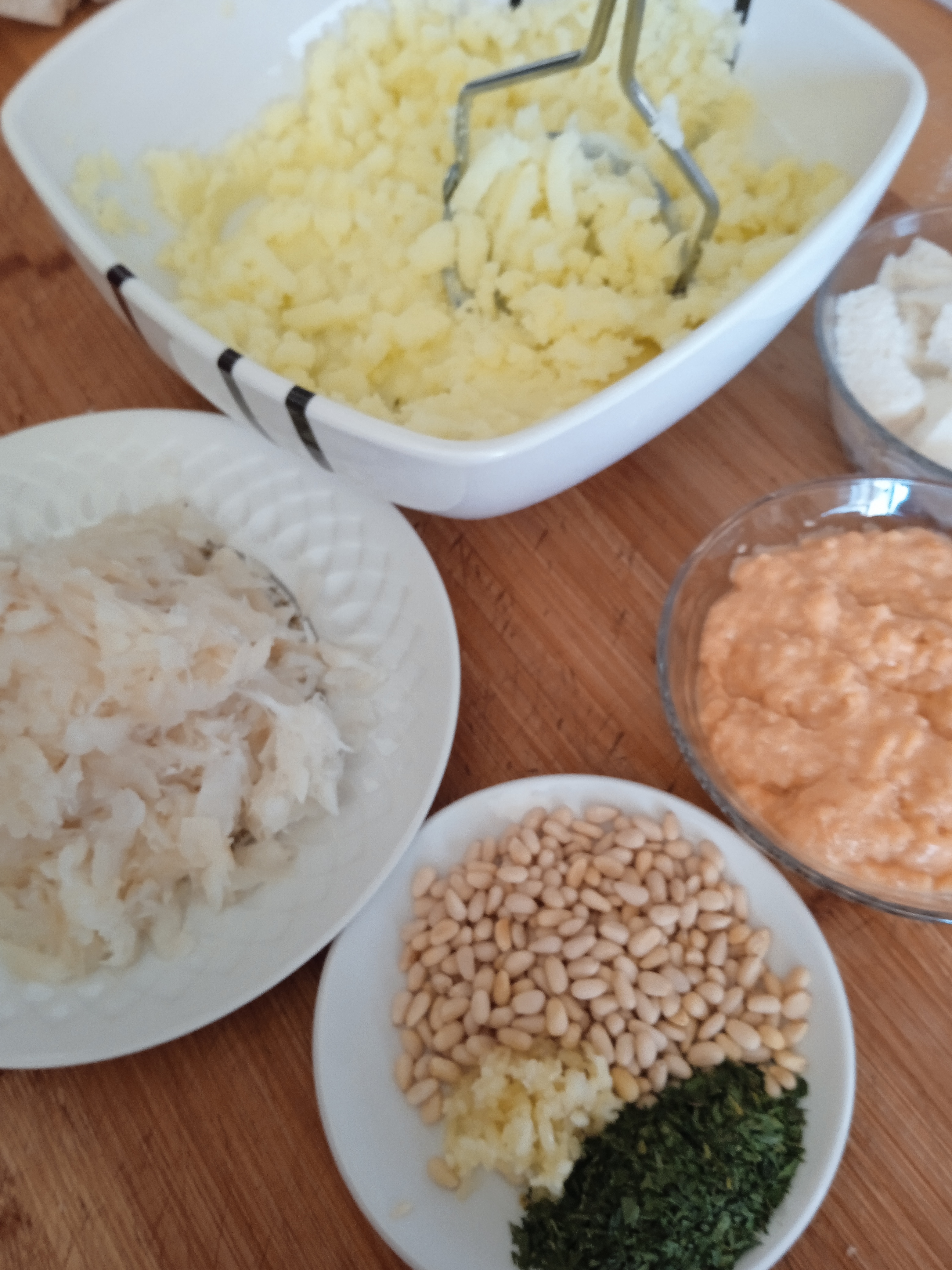 - Añadir a las patatas trituradas, los ajos, el perejil picados, el bacalao desmigado, el pan escurrido de la leche y los piñones.