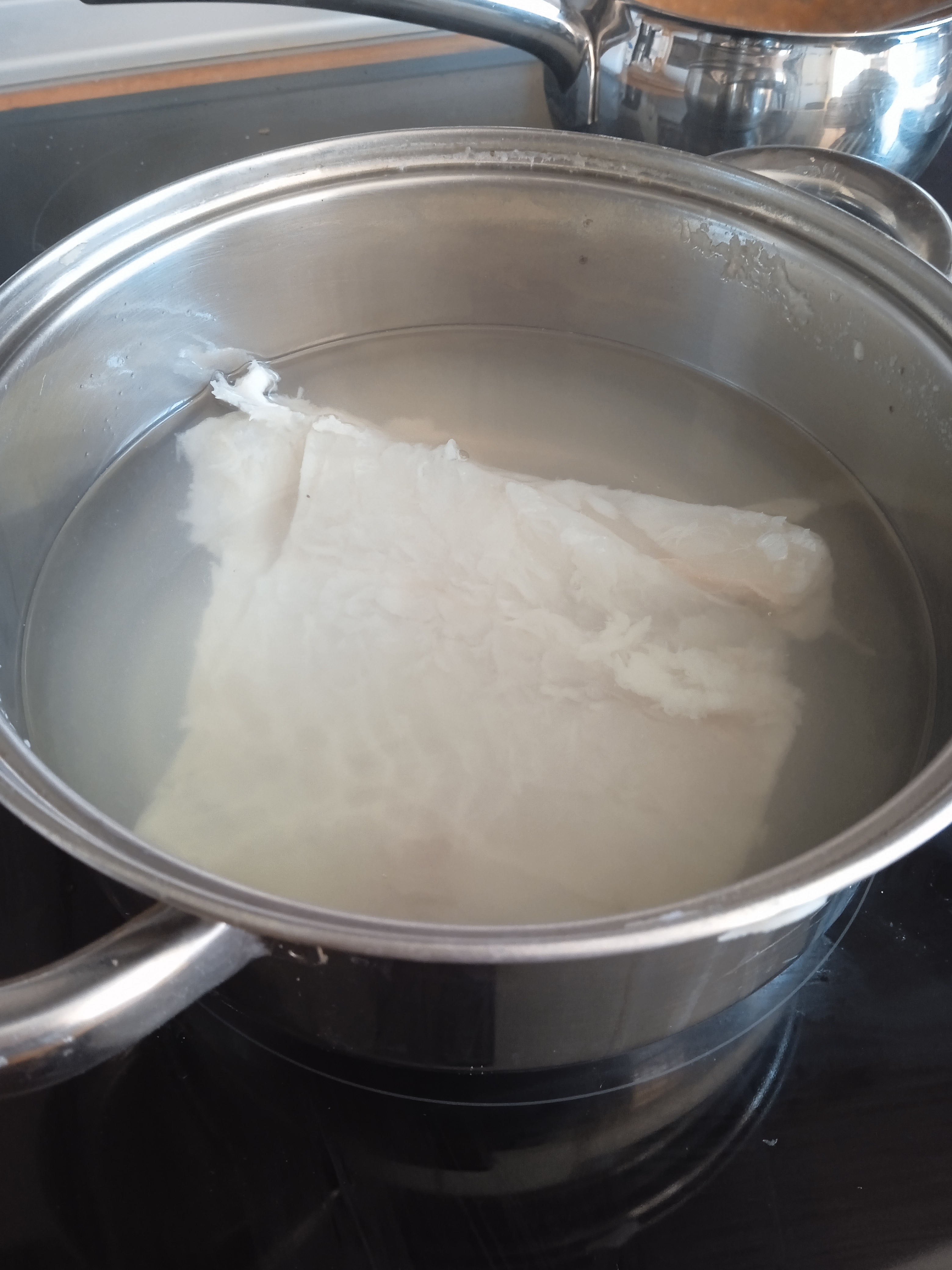 - Pelar las patatas y cocer en una olla de 30 a 35 minutos, comprobar que estén bien cocidas, retirarlas, pasándolas a un bol, y triturar, reservando el agua caliente, (fuera del fuego) introducir en ella el bacalao, dejándolo infusionar de 3 a 4 minutos.