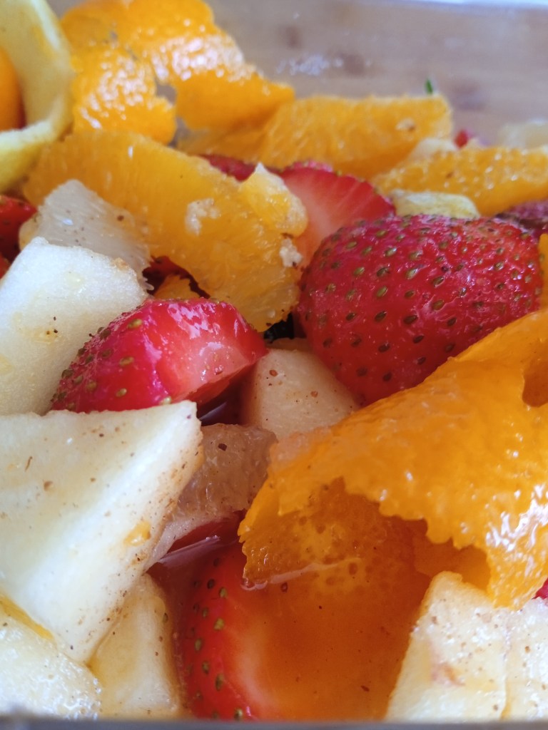 - Exprime la naranja que queda , el medio limón y riega todas las frutas y especias.