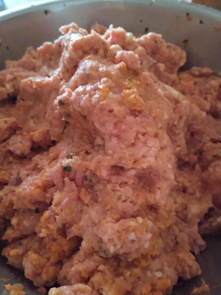 - En bol o cuenco grande, poner la carne y añadirle la sal,la pimienta, el comino, el perejil, piñones y mezclar.