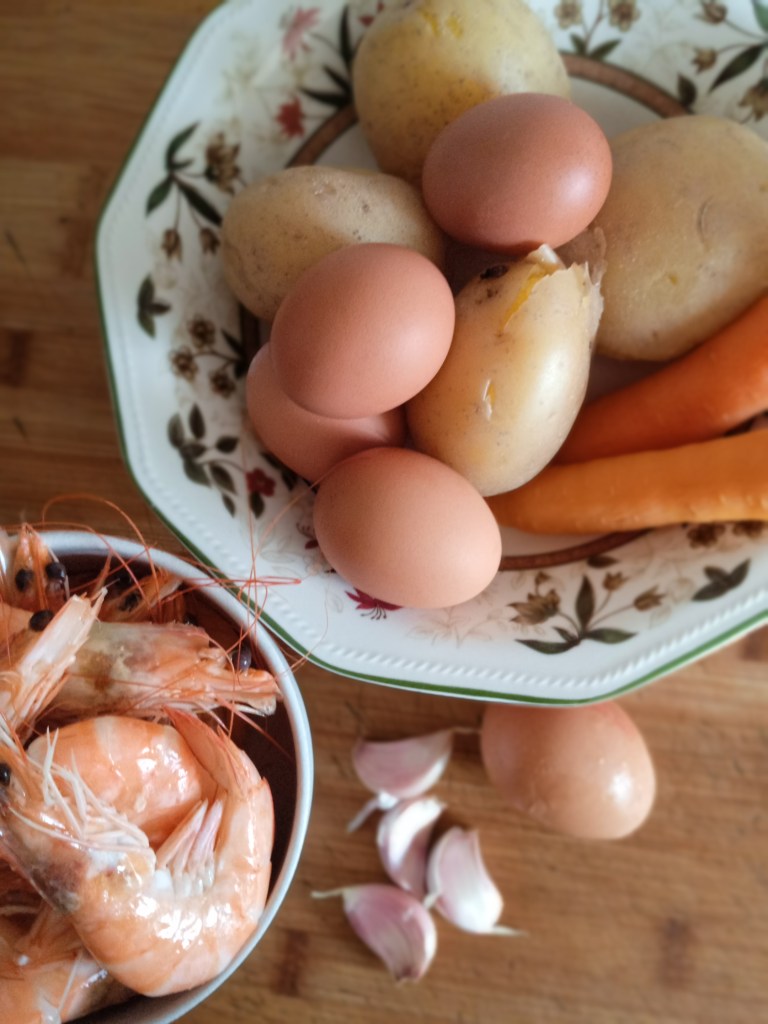- Preparar una mayonesa con el aceite de las cáscaras y el huevo que queda, una pizca de sal, toque de pimienta.