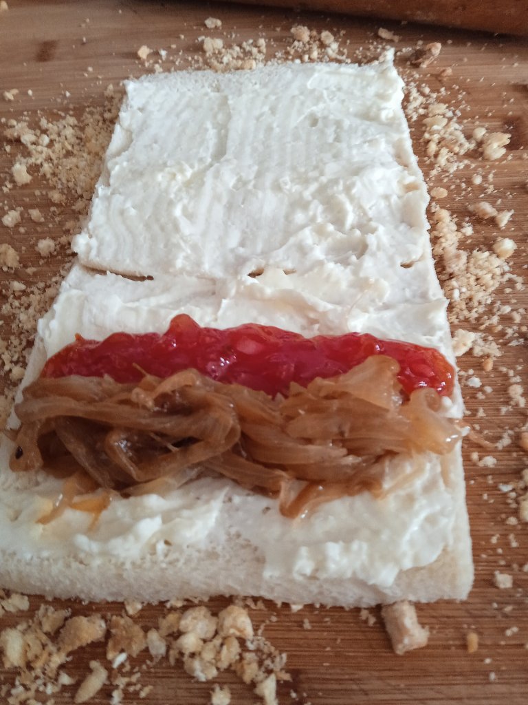 - Al lado de la mermelada pon otro cordón con la cebolla ya fria.