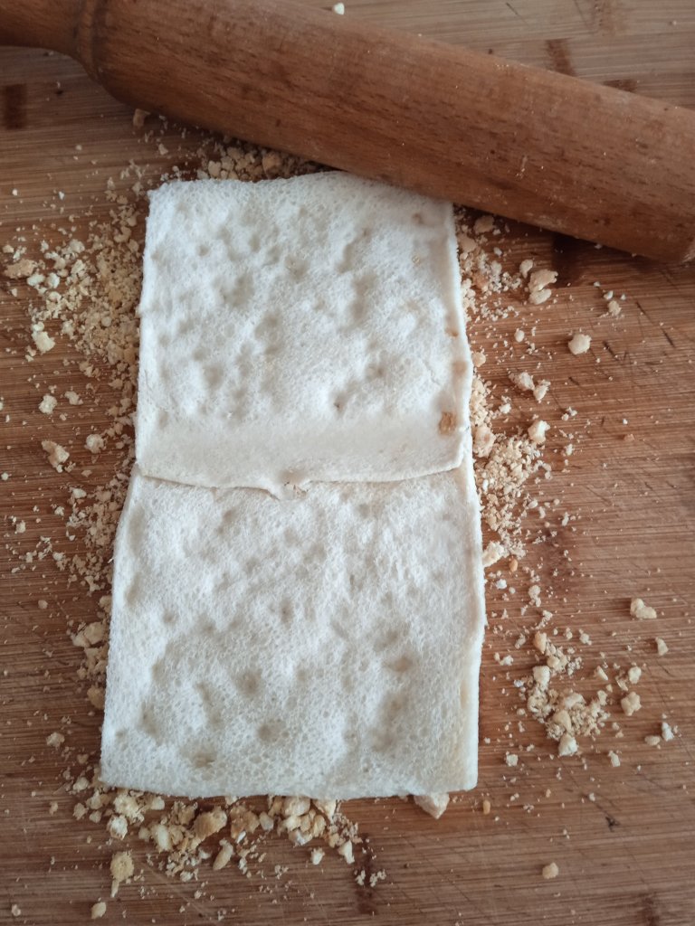 - Pon encima, una detrás de otra y que monten un poquito, las 2 rebanadas de pan y pasa el rodillo por encima, dejando el pan fino y se pegara por la otra cara la picada de corteza de cerdo.