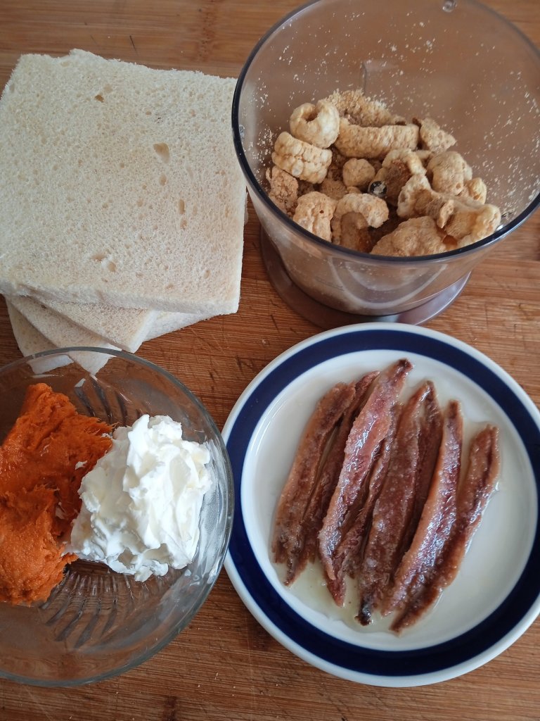 - Para distinguir mejor de la anterior receta, cambia las cortezas de cerdo, por almendras , pistachos, avellanas, incluso por papas frias pero estás no podrán estar mucho tiempo antes preparadas pues se reblandecen.