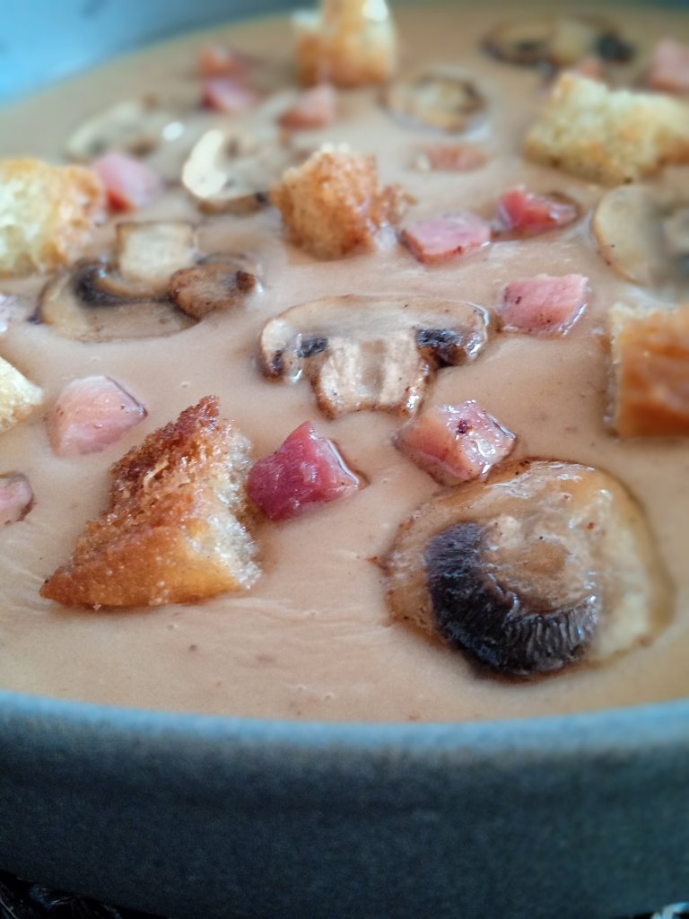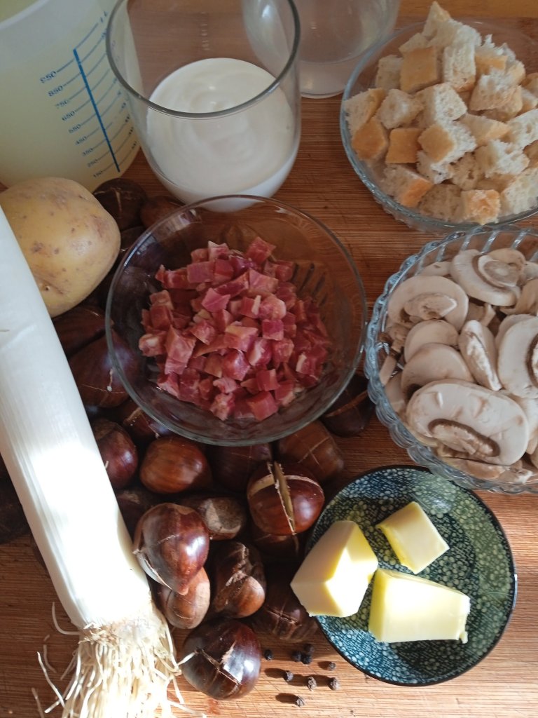 - Sirve la crema de castañas bien caliente, con unos tostones de pan y unas cucharadas de setas con jamón .