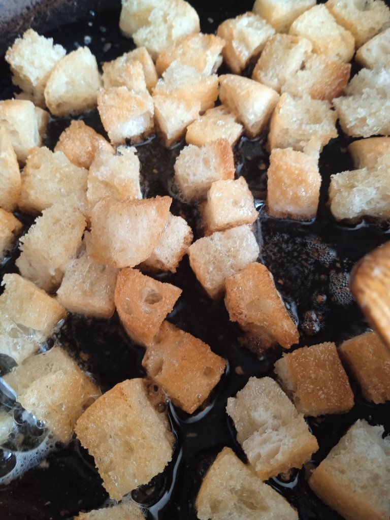 - En una sartén aparte, doramos el pan en cuadritos pequeños con 8 cucharadas de aceite y la mitad de mantequilla, y retiralos sobre papel de cocina.