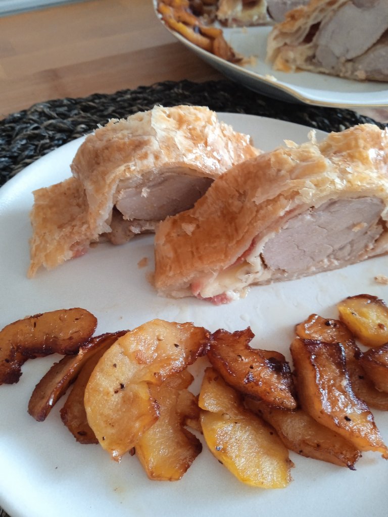 - Puedes cambiar la guarnición por otra que prefieras o en vez de hacer laminas de manzana puedes hacerlas en cuadritos, quedará con más volumen e igual de ricas.
