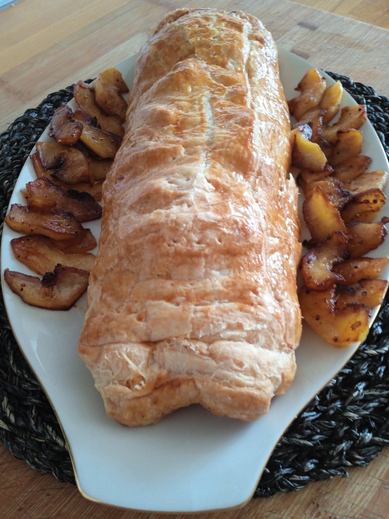 - Cubre con cuidado, el solomillo con la masa de un lado, utilizando el papel que protege la masa, cuando ya lo tengas medio cubierto, retira el papel de ese lado, y haz lo mismo del otro lado, dejando ese papel debajo, que te servirá para trasladarlo y también para hornear.