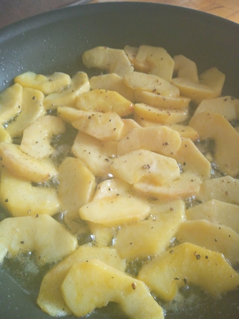 - Corta en gajos de medio centímetro y llévalas a una sartén con el resto de la mantequilla a fuego medio bajo.