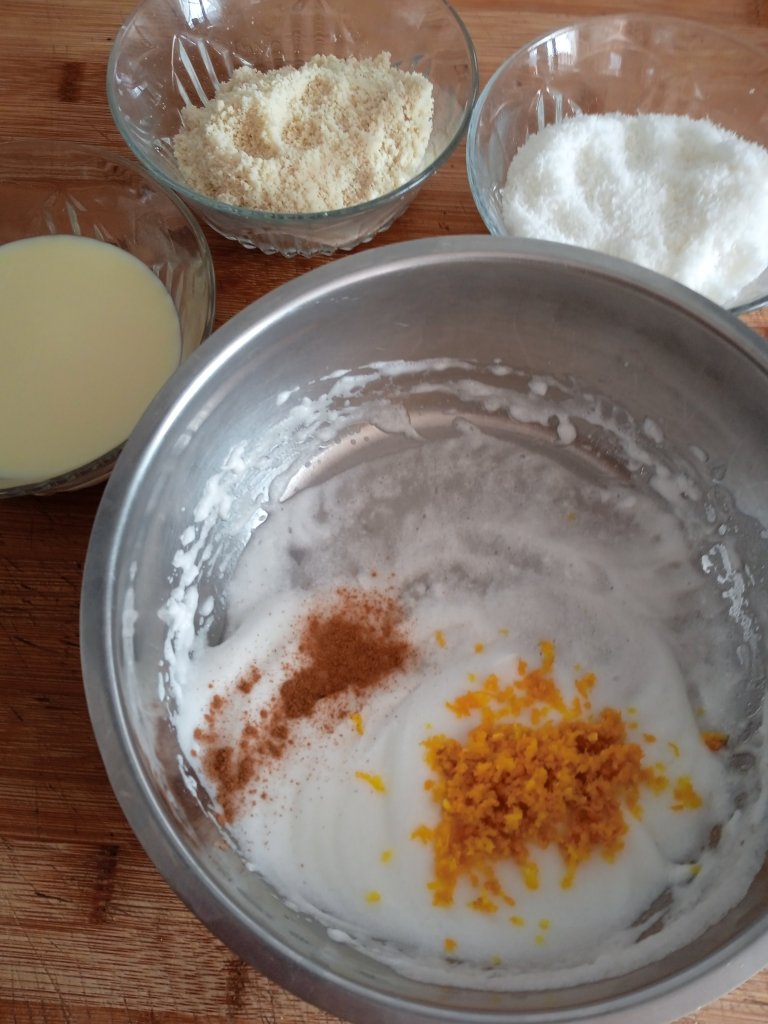 - En un bol, mezcla la leche condensada, el coco, la almendra, la ralladura de naranja y la canela.
