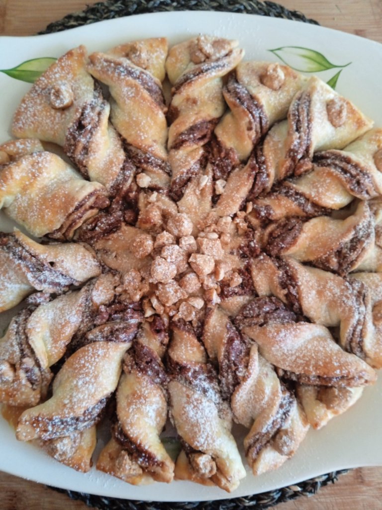 - Extiende levemente con las manos el disco de la pasta brisa y untala con la mitad de la crema de avellanas, dejando alrededor como 1 – 1,5 cm libre.