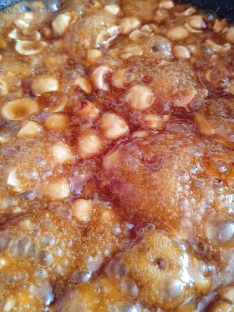- Pon en una sarte, el agua, el azúcar y todas las avellanas y deja que se haga el caramelo removiendo y que las avellanas se caramelicen, perdiendo todo el agua, adquiriendo ese color tostado como de miel oscurita.