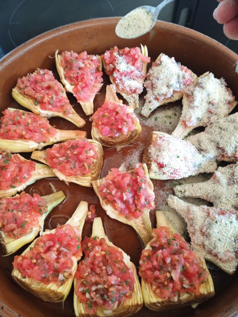 - Cubre y reparte con una cucharita la mezcla de los tomates sobre las medias alcachofas .