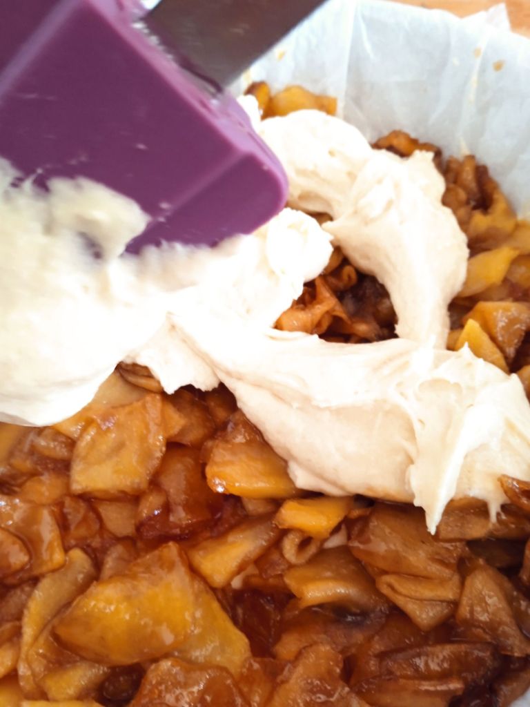 - Reparte por encima, cubriendo toda la masa, la manzana caramelizada.