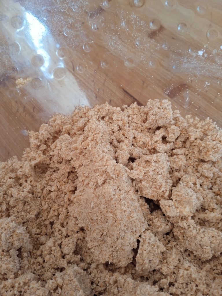 - Añade la mantequilla a trocitos pequeños y mezcla con la harina desmenuzando la y frotándola con los dedos, te quedará como pegotes.