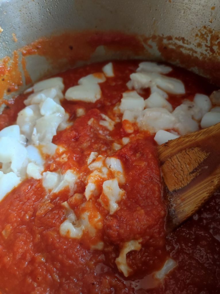 Sepia con piñones con salsa de tomate picante.