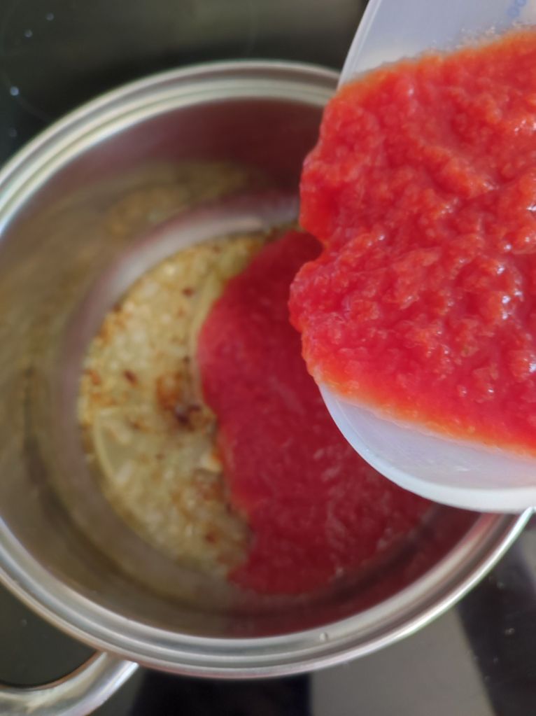 - Añade una cucharada más de aceite al puchero y cuando esté caliente vierte el tomate triturado, deja reducir el tomate 15 minutos, y añade la cucharita de bicarbonato o azúcar para la acidez del tomate, pizca sal y déjalo reducir de 5 a 10 minutos, removiendo de vez en cuando.
