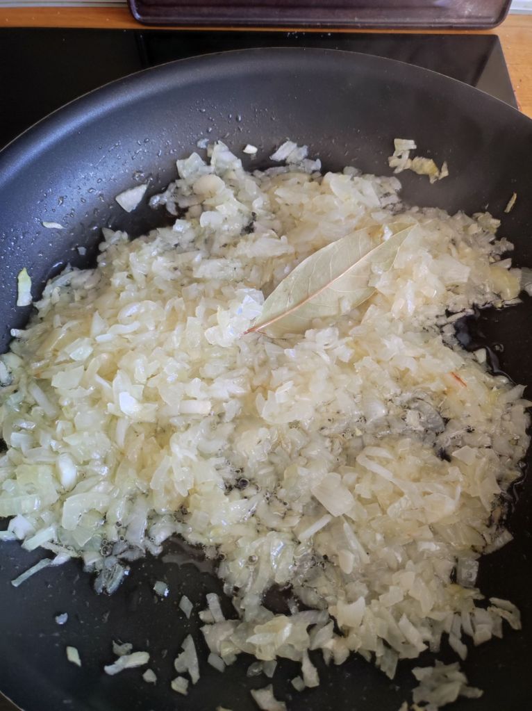 - Pon a pochar en el aceite, las cebollas, los ajos junto con la hoja de laurel, a fuego medio en una sartén grande.