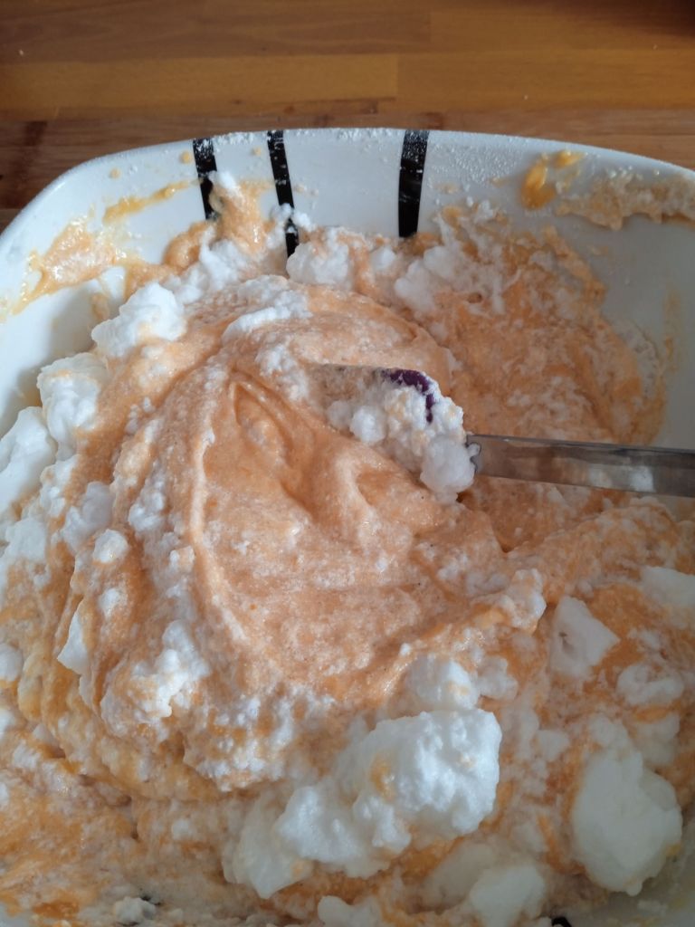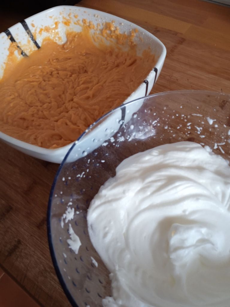 - Incorpora a este puré en dos o tres veces las claras a punto de nieve, mezclándolo con movimientos suaves para que no pierda todo ese aire que le da esponjosidad.