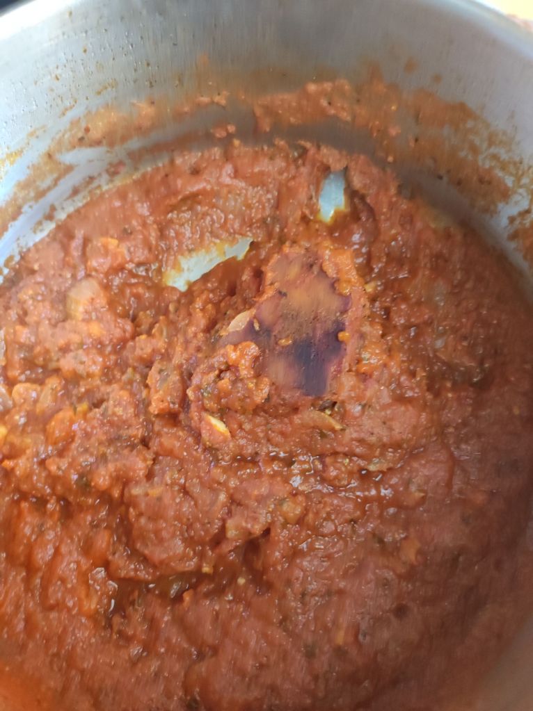 - Una vez pochado añade el tomate triturado, el hueso de jamón escurrido (el agua de hervir el jamón tirala), las especias y el medio vaso de agua, deja que hierva tapado removiendo de vez en cuando sobre 20- 25 minutos, a fuego medio.