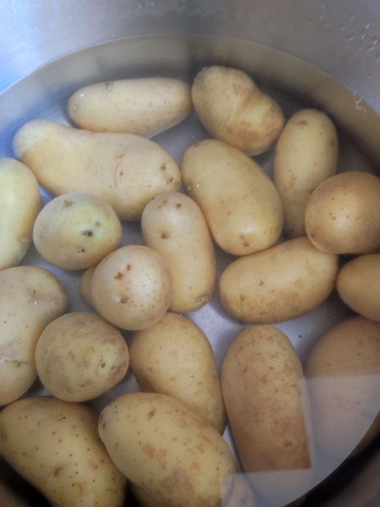 - Pon a hervir durante 5 minutos las patatas de guarnición, si estás utilizado patatas normales más grandes déjalas hervir 10 minutos, eso sí ambas con piel, sin pelar.