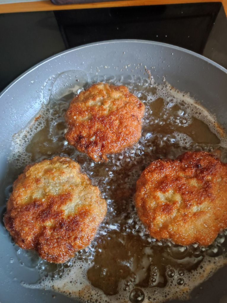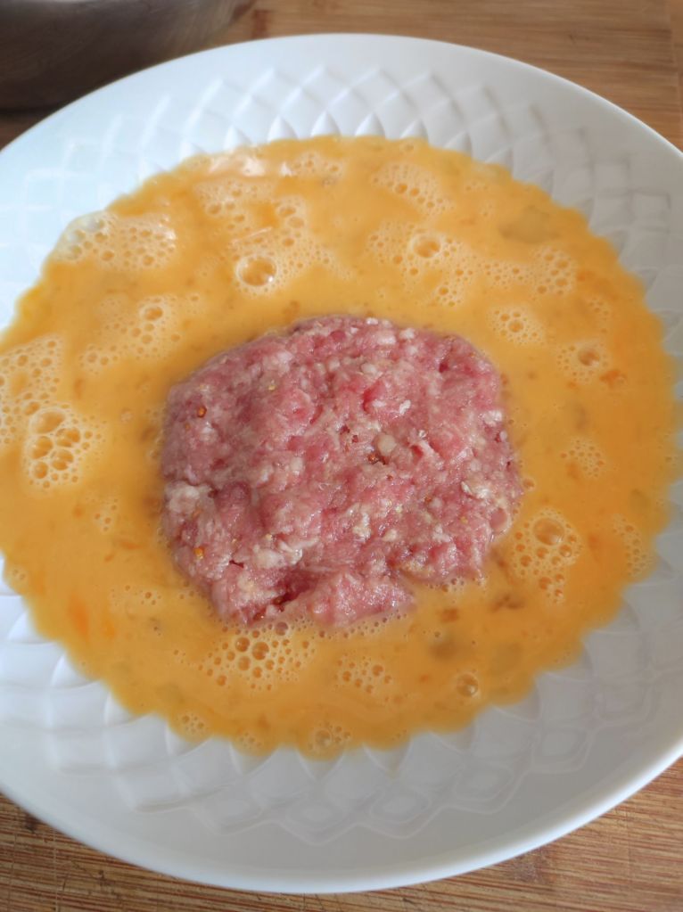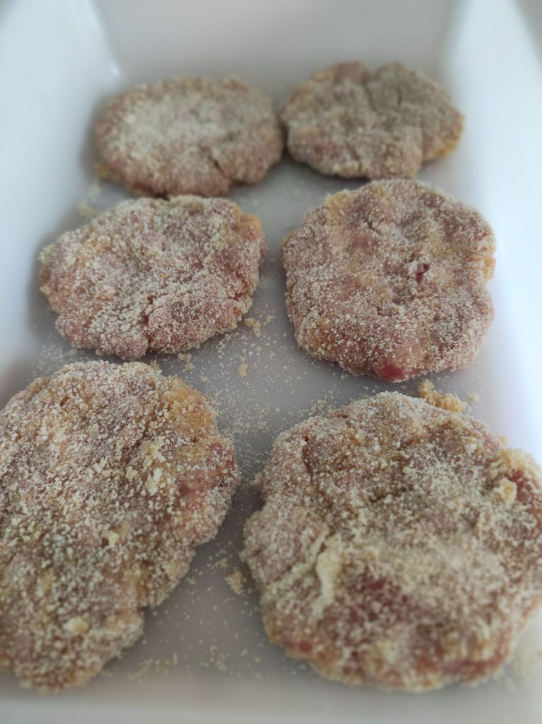 - Aplana las bolas de carne al tamaño que prefieras, pasala por el huevo batido y luego por el pan rallado, reserva hasta que las tengas todas.