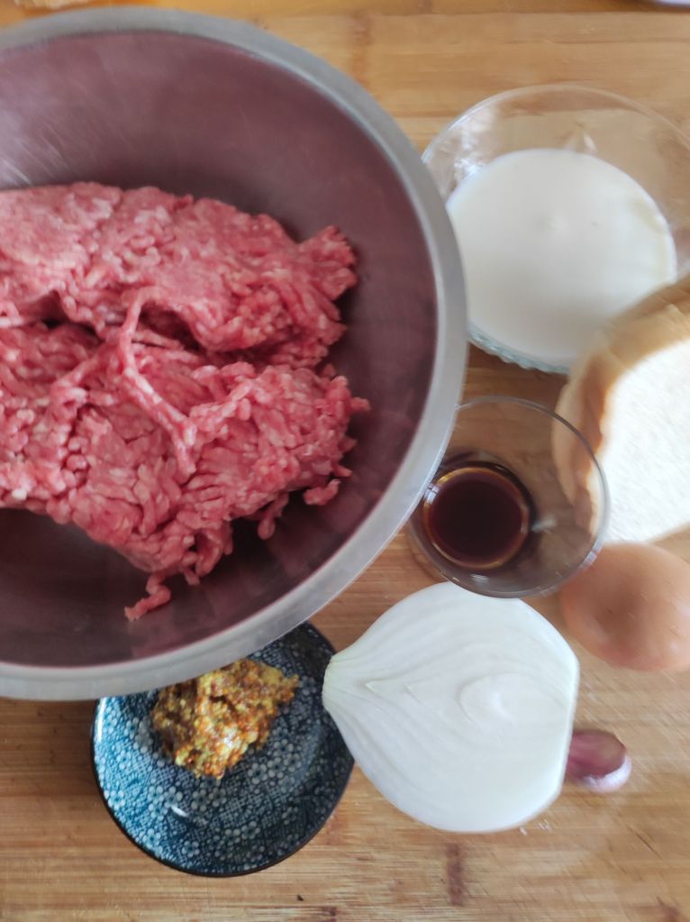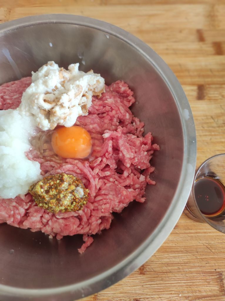 - Añade a la carne, la cebolla y el ajo picado, 1 huevo entero , toque de pimienta, la mostaza, el pan de molde escurrido de la leche, y la salsa Perrins.