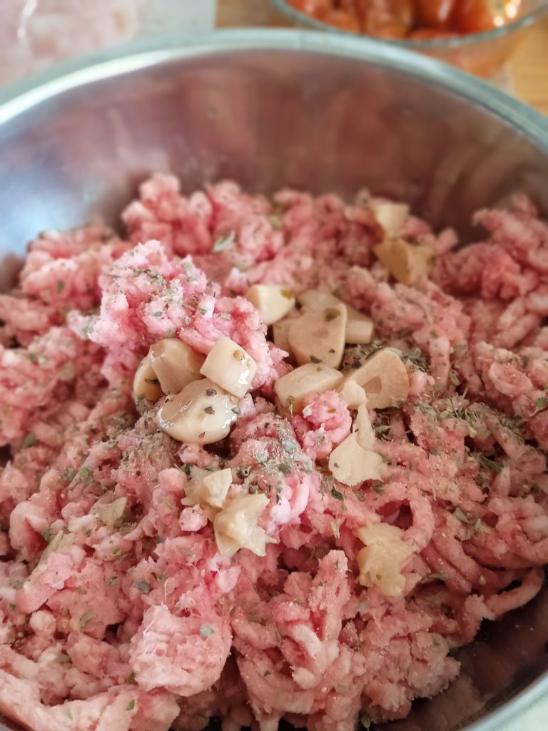 - Saca los trocitos de ajo del aceite y añadiéndolos a la carne picada, no los pongas todos, solo la mitad, también añádele una cucharada de ese rico aceite con oregano, mezcla bien.