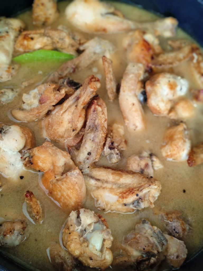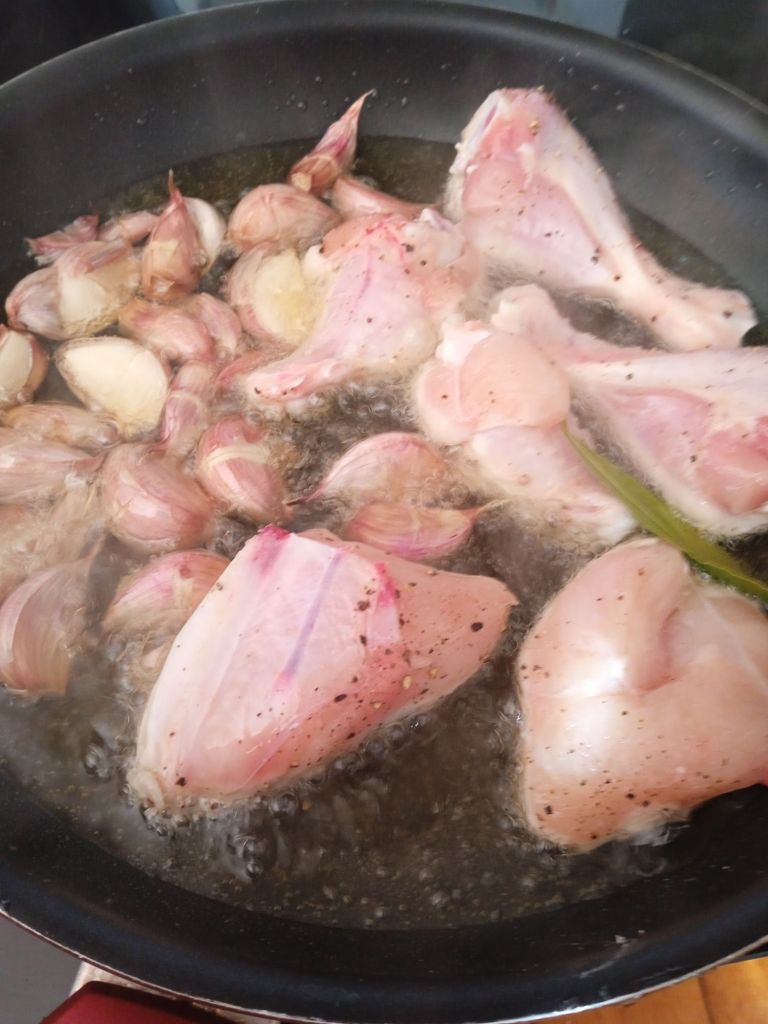 - Pasa los trozos de pollo ya fritos a una cazuela junto con el laurel y 10 – 12 cucharadas del aceite de freir el pollo.