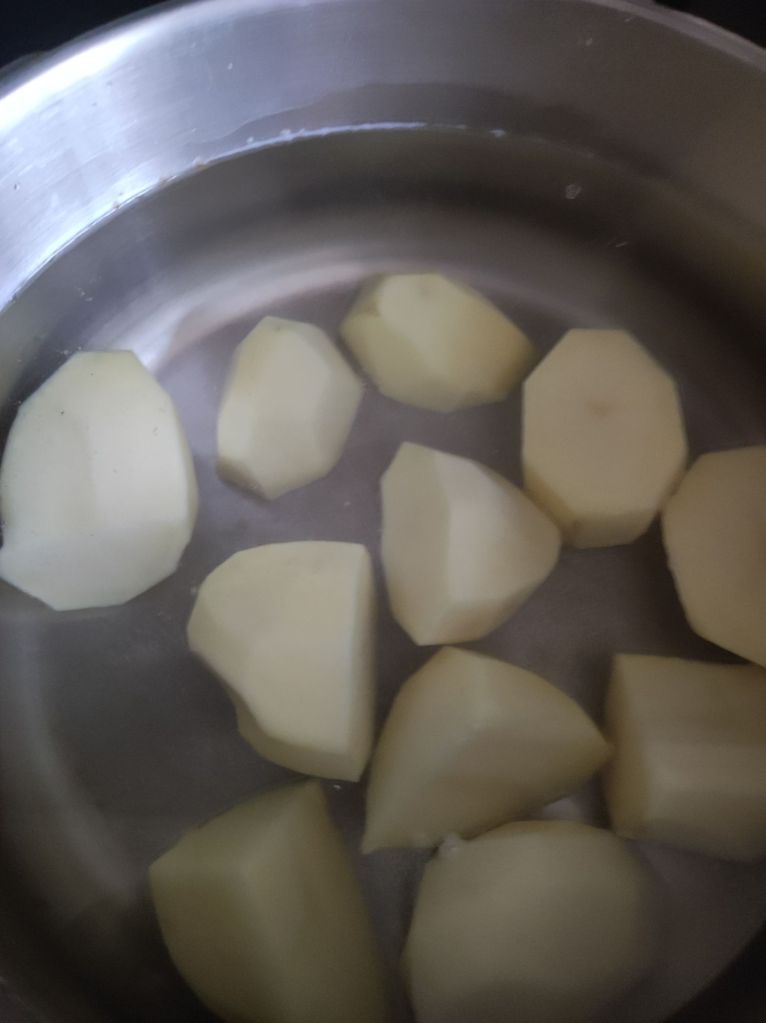 - Pela y corta en trozos grandes las patatas, lávalas, y hierve en abundante agua con una cucharita de sal en una olla grande y déjalas cocer 10 minutos solas.