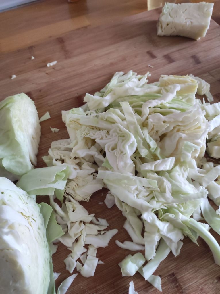 - Corta en juliana el repollo o la col eliminando el tallo duro del centro y las hojas exteriores si están estropeadas, y lávalo.