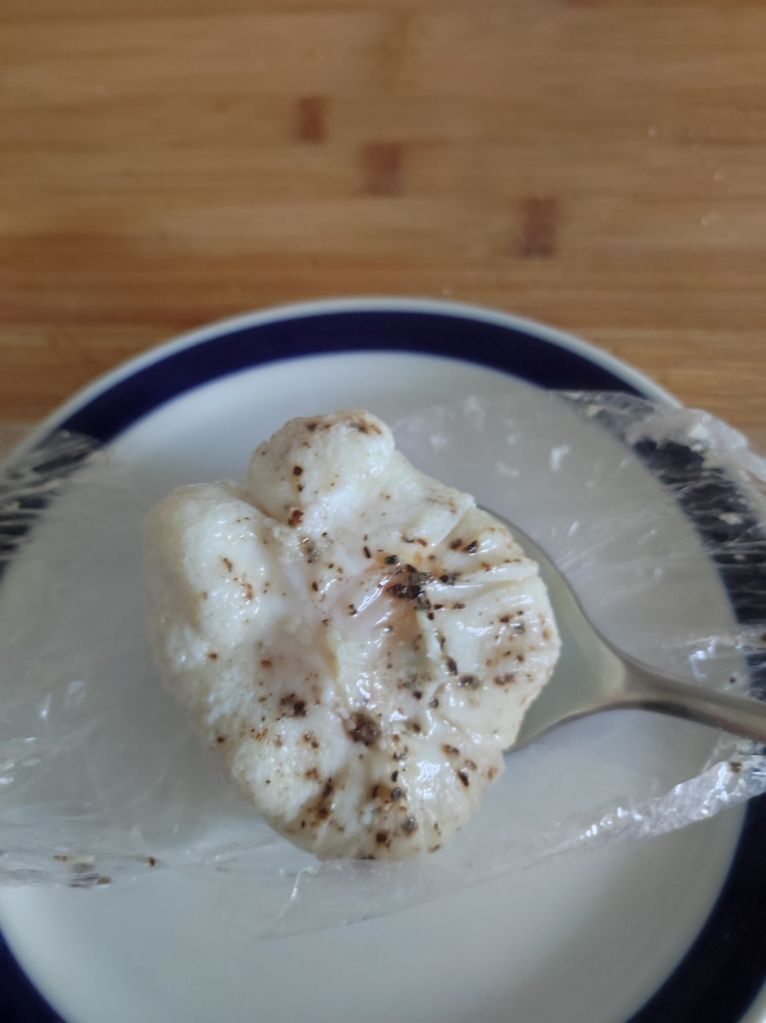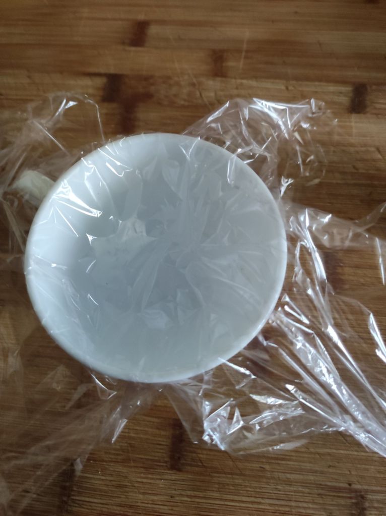 - Utiliza una taza, vaso o cuenco con la boca ancha y tapa la boca con film grande dejando en el centro de taza hundido para que quepa bien el huevo crudo.