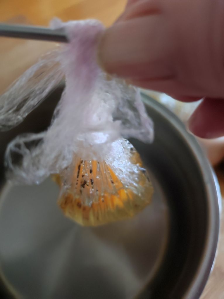 - El truco está en el film sea lo bastante largo y poder sujetar en un pincho o mango del tenedor varios a la vez, también puede hacerle un nudo con otra tira pequeña de film, sellándolo bien y dejarlo caer dentro del cazo.
