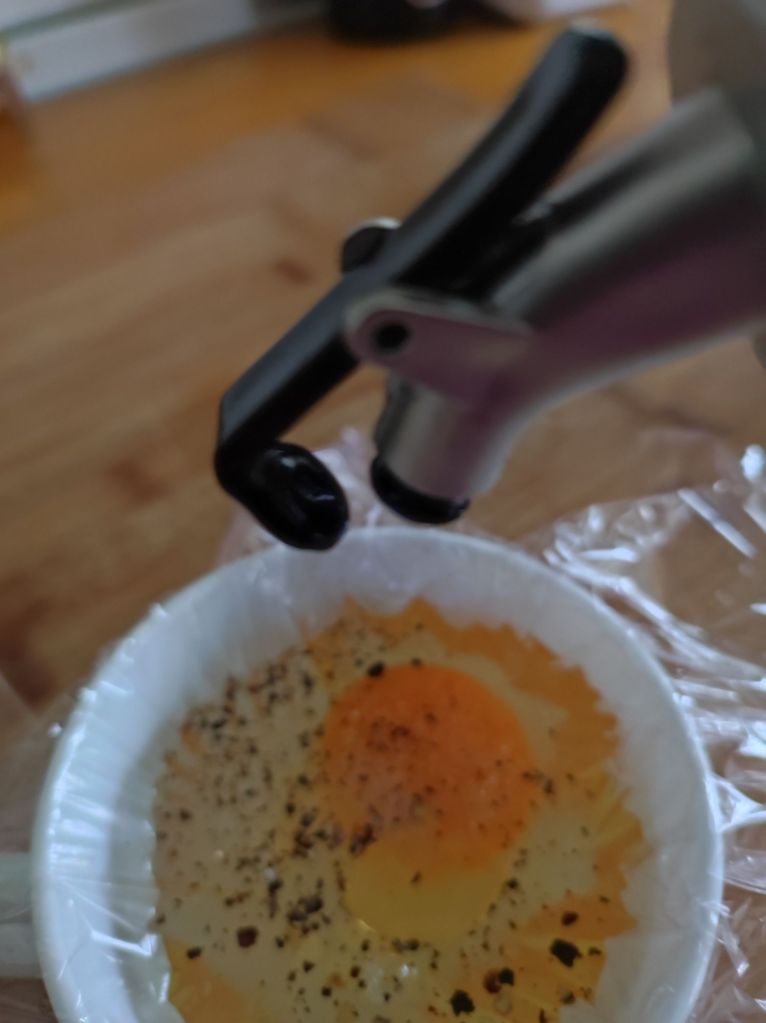 - Pon en ese hueco, unas gotas de aceite, el huevo, pizca sal y pizca pimienta negra.