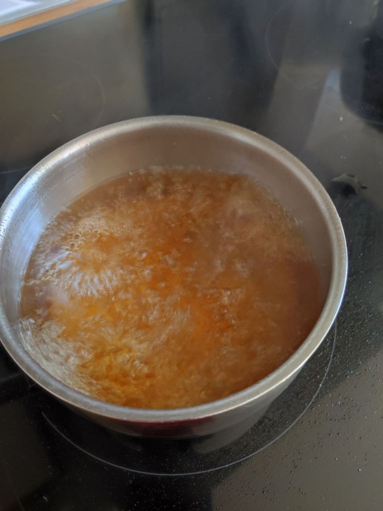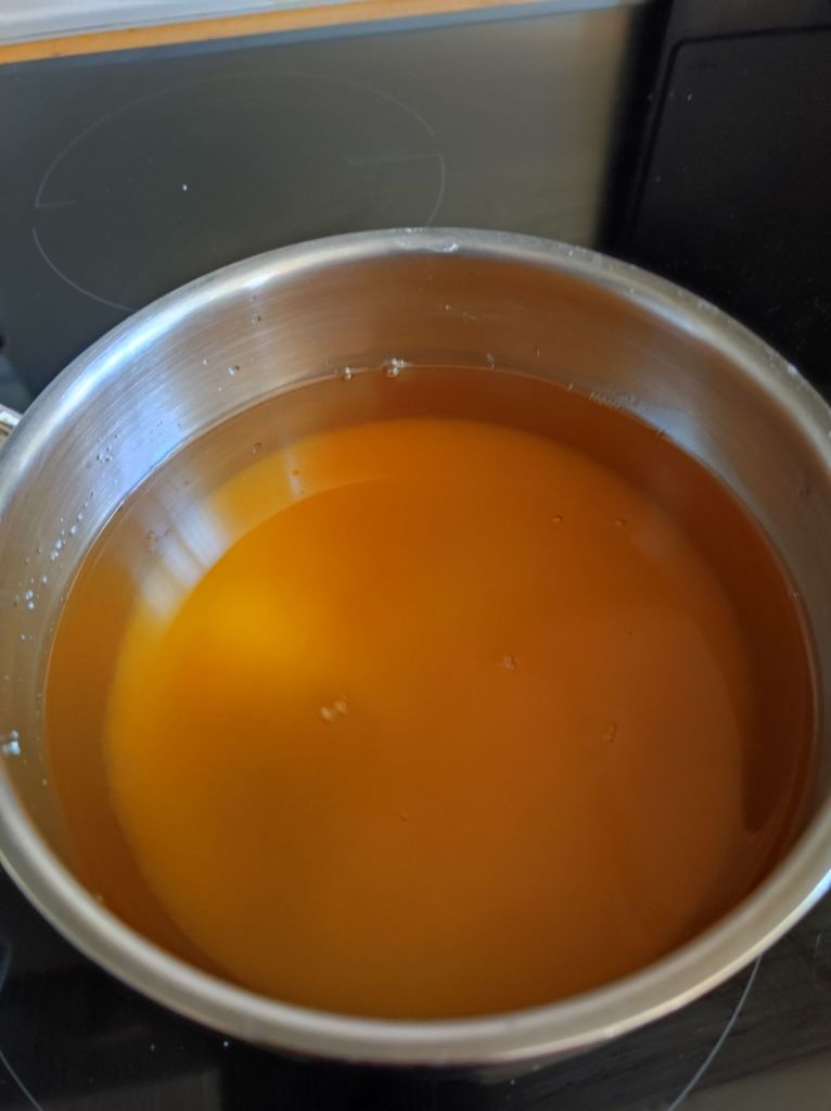 - Pon en un cazo todos los ingredientes a fuego medio alto, remueve hasta que veas que el azúcar se disuelve, esto no tardara más de unos minutos.