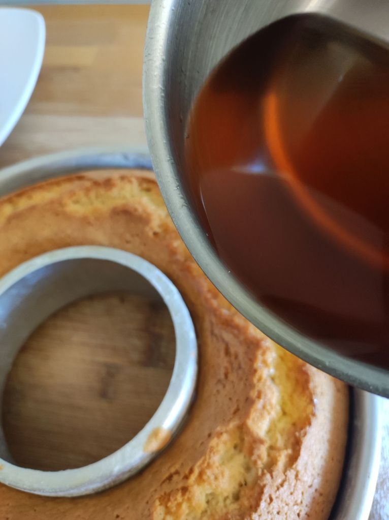 - Baña con el almíbar caliente todo el bizcocho, repartiendo bien el almíbar por toda la superficie y dejando que lo absorba antes de verter más, puedes pincharlo más si ves que lo necesita.