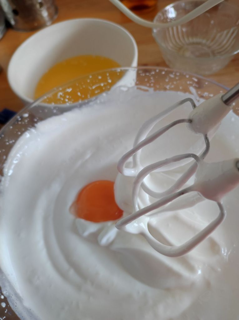 - Batir las yemas de los huevos para incorporar poco a poco con una lengua pastelera a las claras montadas, con movimientos envolventes, que queden bien integradas.