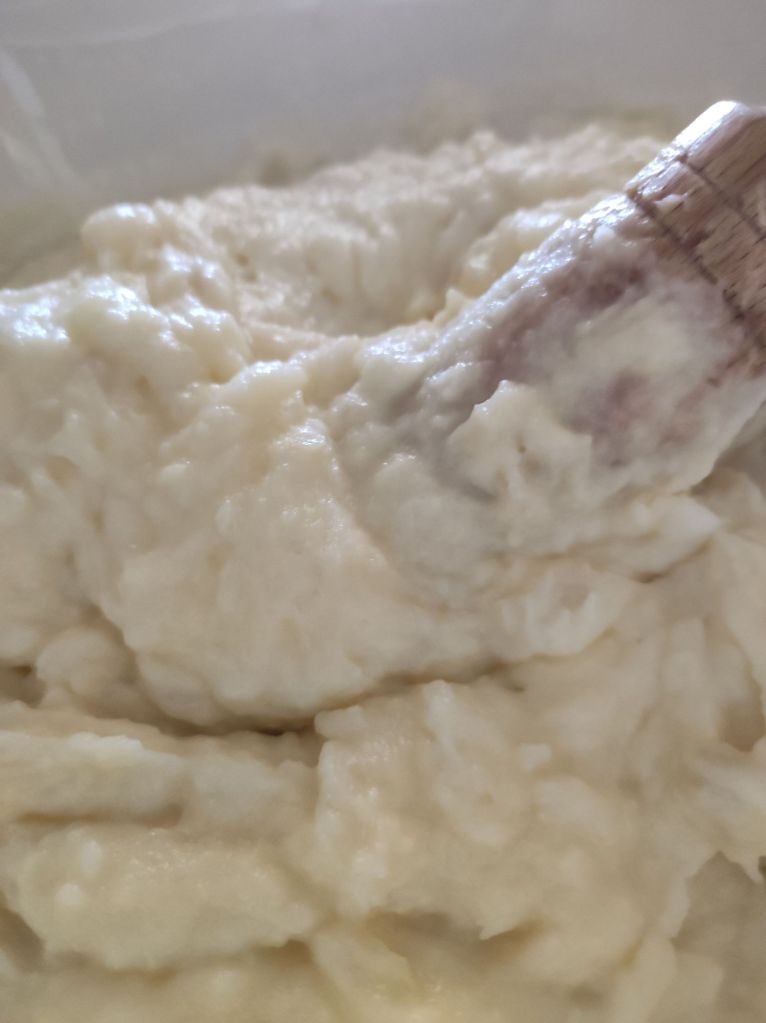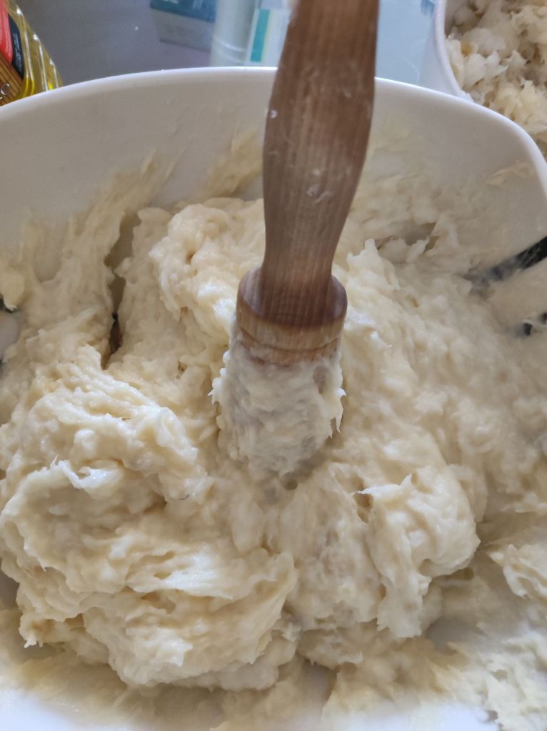 - Añade un poco de bacalao desmigado, chorrito de aceite y sigue girando, te aconsejo que de vez en cuando golpees la masa con la maza para romper más las fibras del bacalao y posibles trocitos de patata.