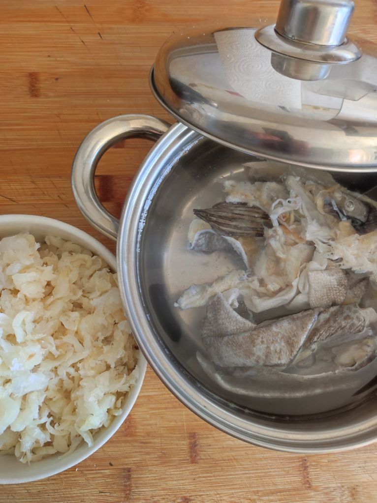 - Y ahora con paciencia, saca todas las mollitas del bacalao libres de las espinas, necesitas 450 grs para la receta y lo más desmigado que puedas, las espinas ponlas junto a las pieles.Con el resto de bacalao sobrante simplemente ponlo con aceite ajos muy triturados para tostadas, ensaladas, empanadillas, etc…..