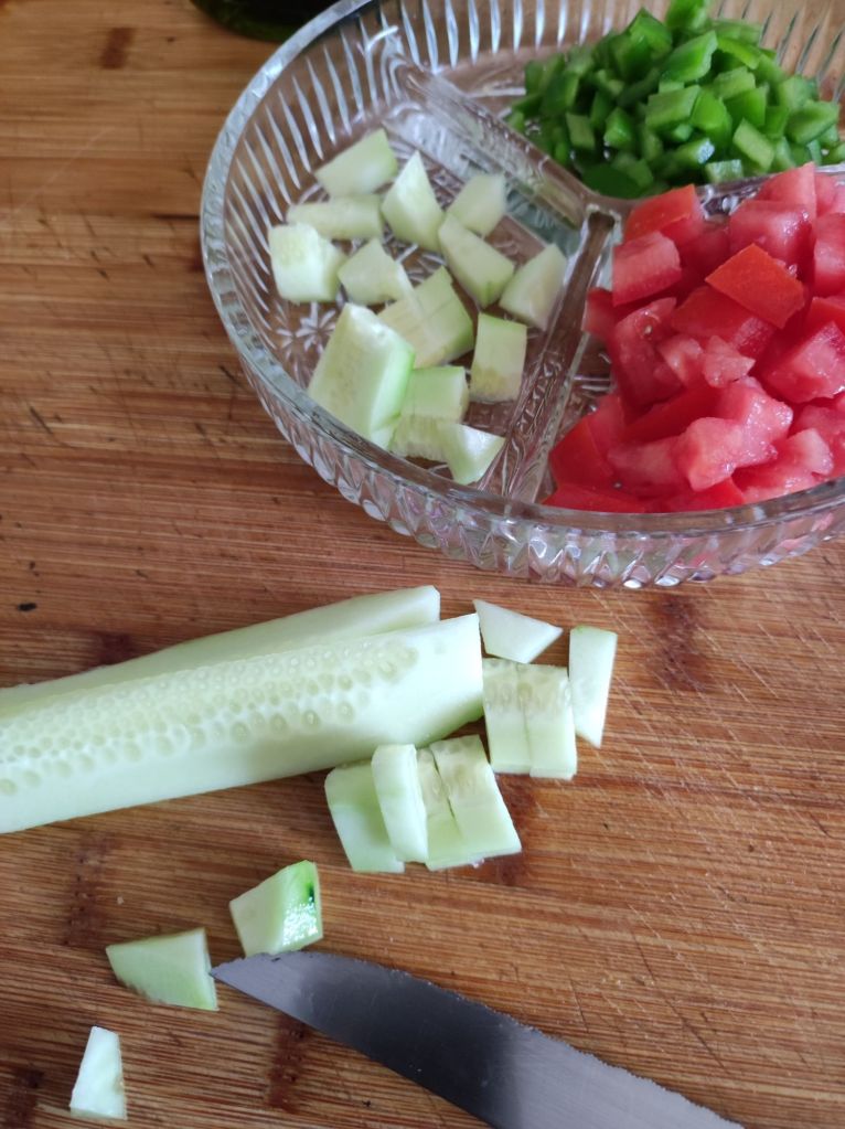 - Corta en cuadritos pequeños, el tomate, el medio pepino, el medio pimiento, el trozo de cebolla y distribuye en un plato, para que cada cual se ponga los tropezones que quiera.