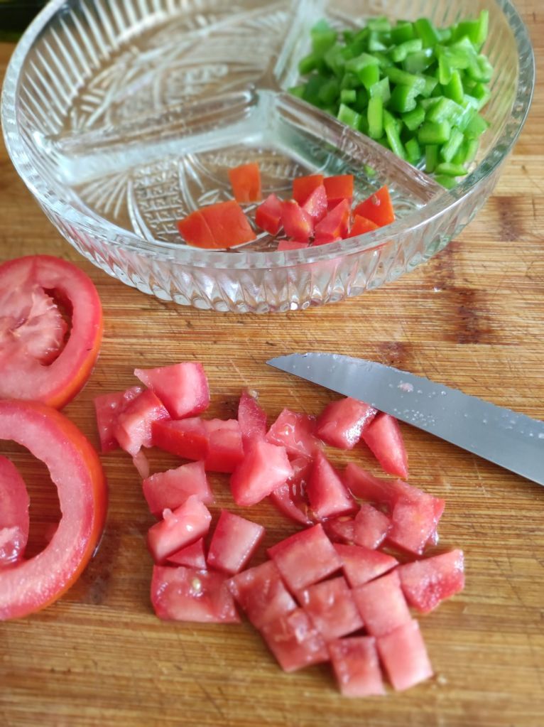 - Mientras lava todos los tomates y el pimiento verde, también puede ser rojo o un trozo de ambos.