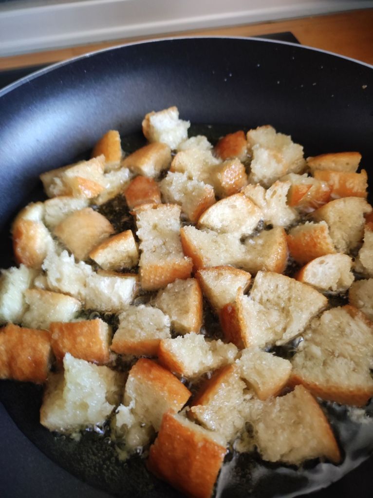 - Freir el pan en aceite de oliva, cuando esté dorado retirar y ponerlo sobre papel de cocina para que absorba el aceite .