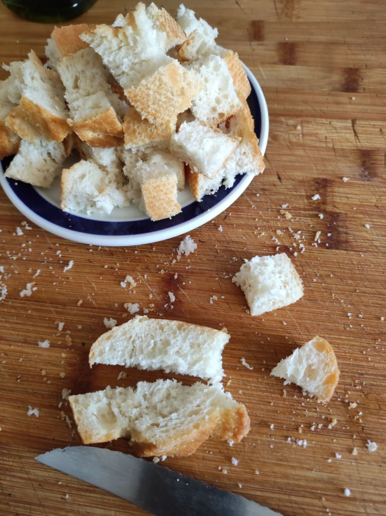 - Corta el pan en rebanadas y luego en cuadritos, el pan mejor del día anterior.