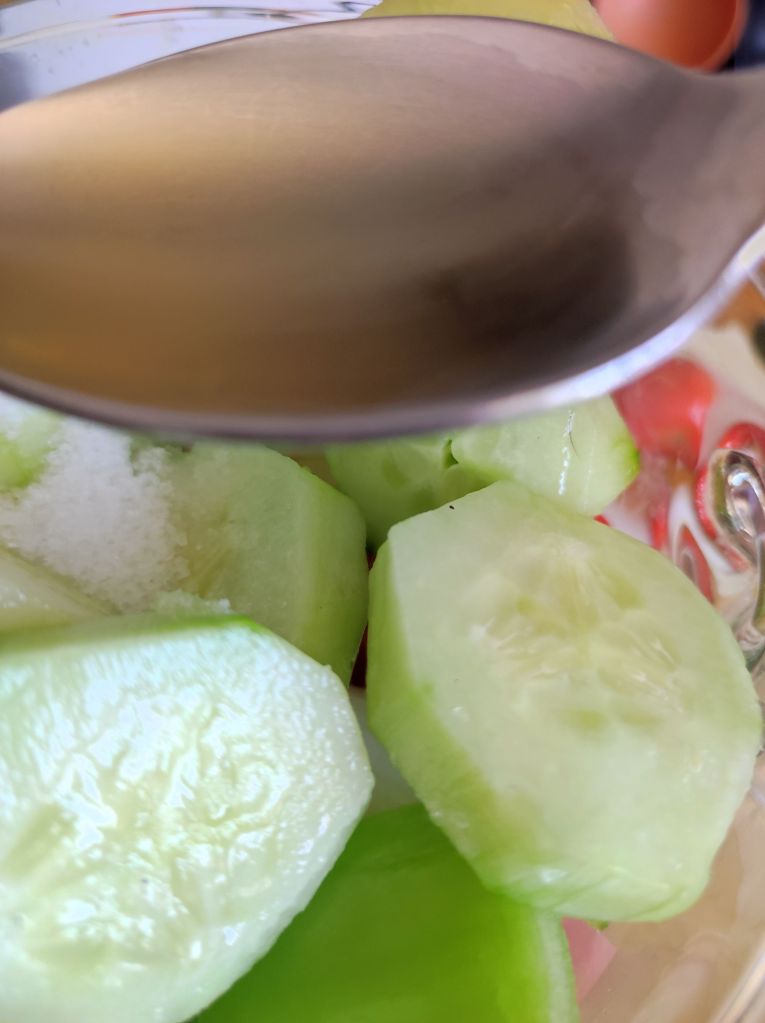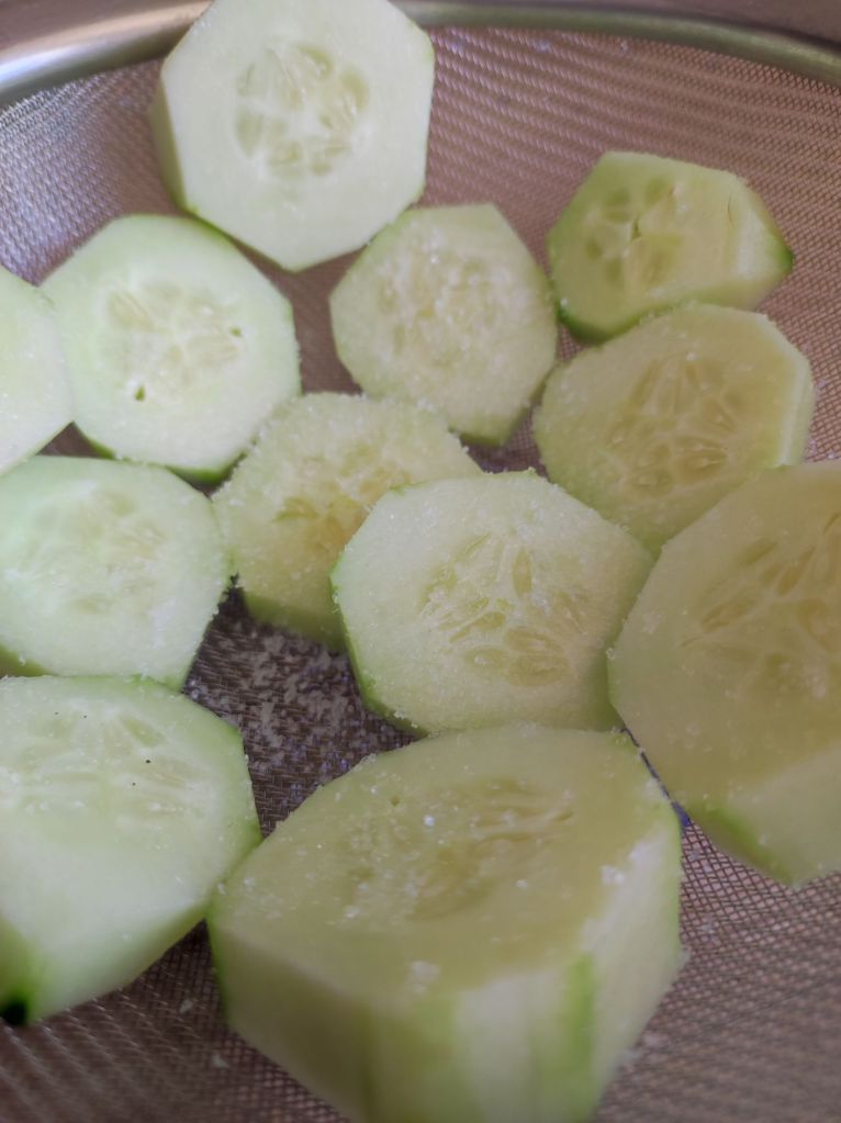 - Pela y corta a rodajas el pepino y ponlo dentro de un colador grande rociado con sal, sobre un cuenco, para que sude y suelte su amargor, así también repite menos.