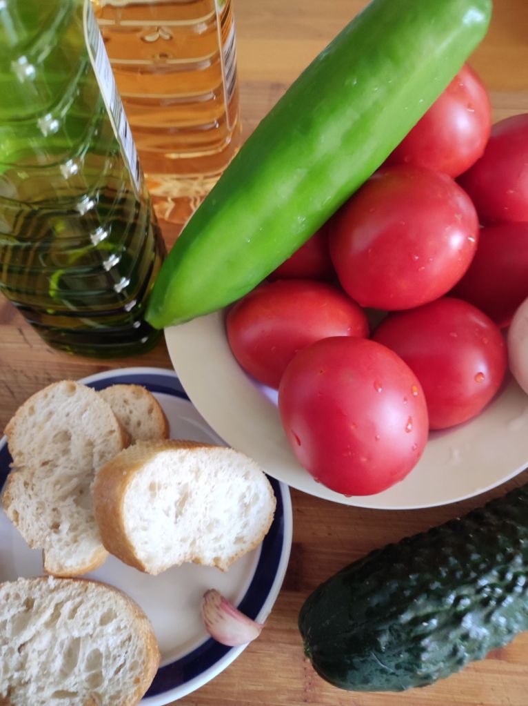Está no es la receta oficial ¡¡Dios me libre!!, no lo pretendo o tal vez, no la conozco , pues dependiendo de la zona de Andalucía llevará distintas cantidades o nada de algún producto, pero lo que está muy claro es que es una de mis recetas preferidas y más en verano, tan fresca, rica, que la tomaríamos todos los días.