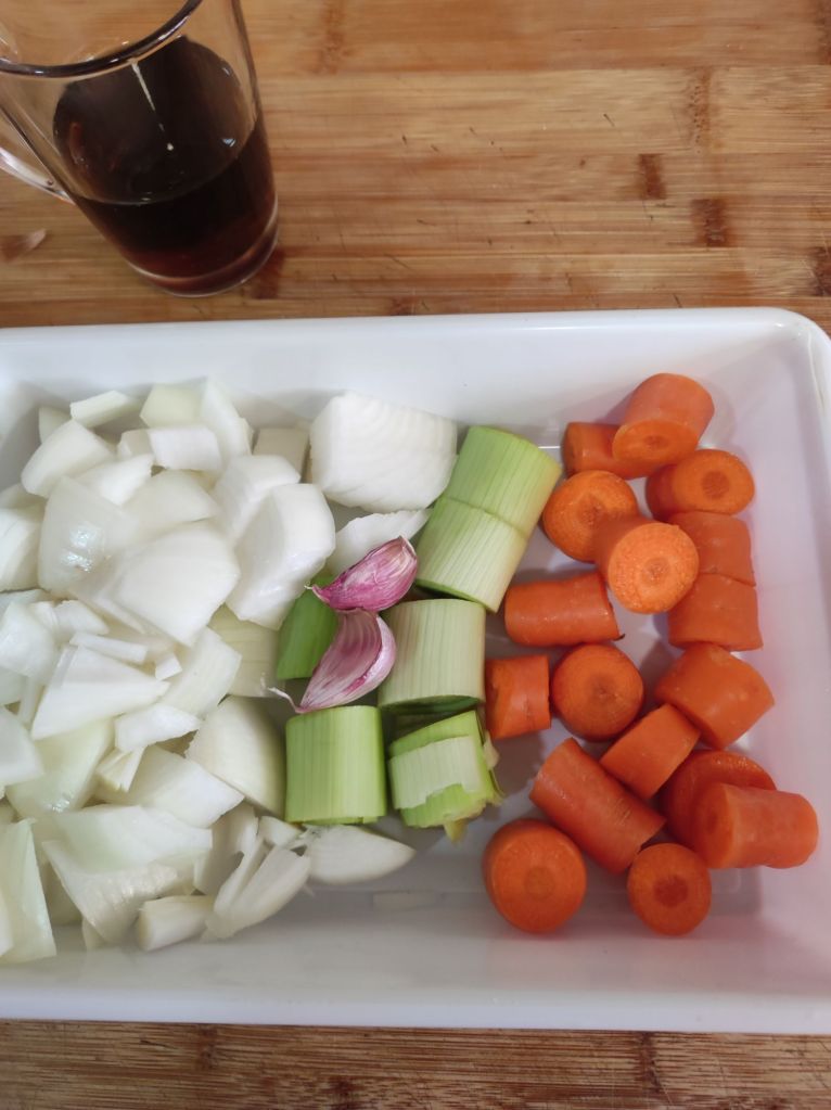 - Pela y córta las cebollas, zanahorias, el puerro,en trozos grandes, los ajos no hace falta que los peles solo dales un pequeño corte.