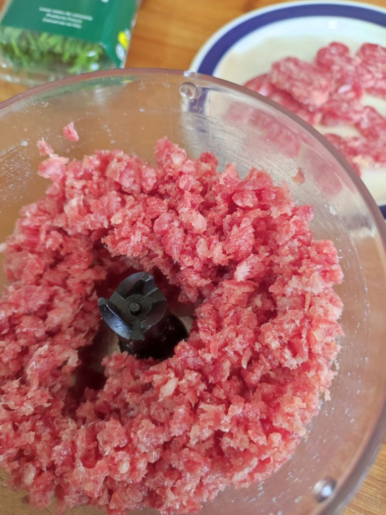 - Corta el resto de fuet en trozos pequeños y pícalo hasta que quede como una masa sin trozos.