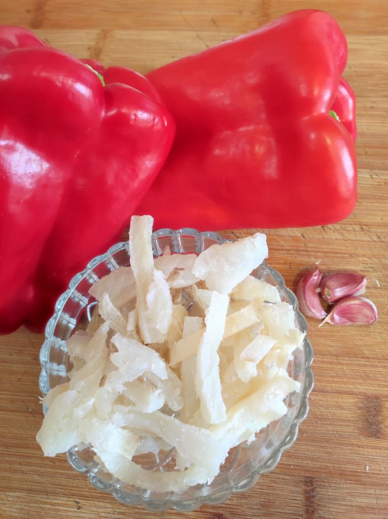 - Mientras se asa el pimiento pon a remojo en agua bien cubierto el bacalao desmigado salado.
