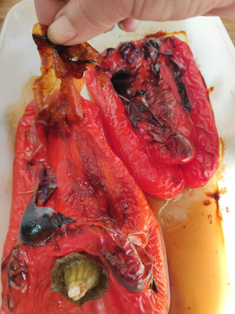 - Colócalo en una fuente y hornea de 45 a 50 minutos según sea tu horno, la piel se soltara de la carne del pimiento, ennegrecida por el asado.
