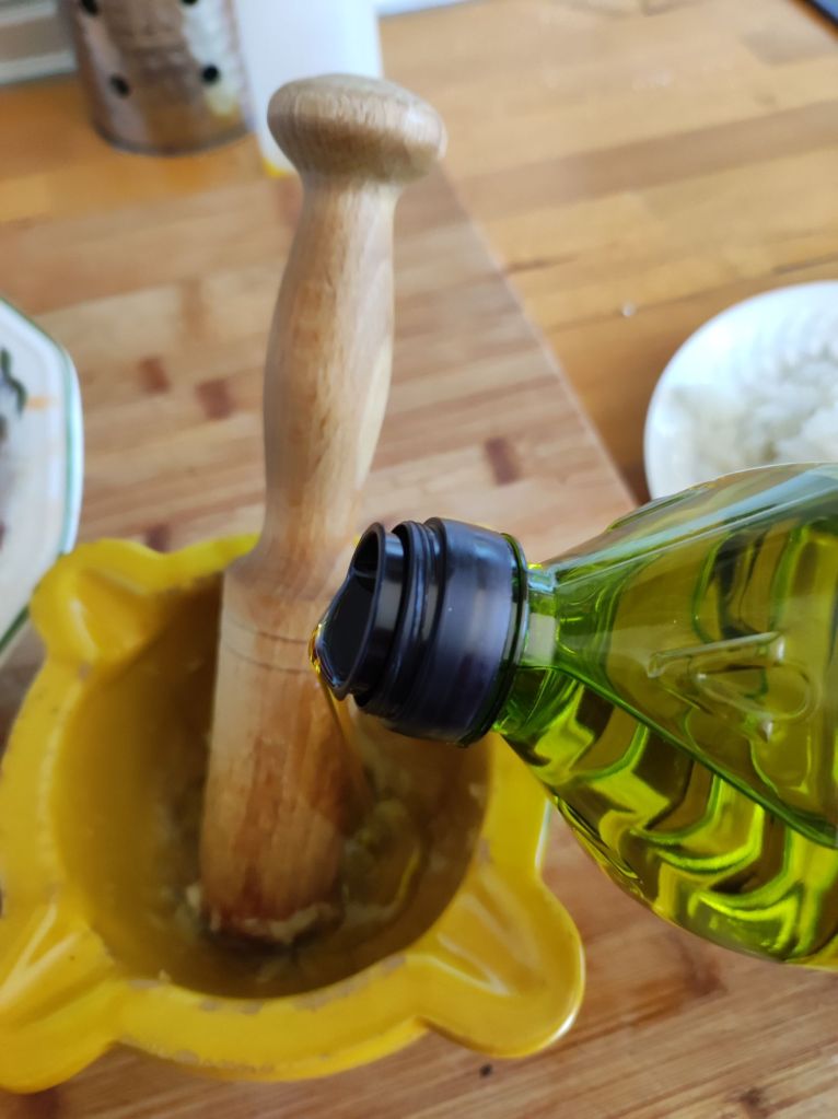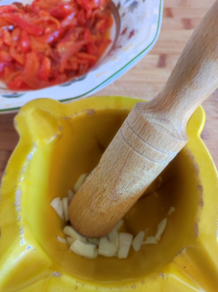 - Pela y pica los ajos en trocitos muy pequeños, yo los he majado en el mortero para que no salga ningún tropezón de ajo, añado un chorrito de aceite, remuevo y reservo.